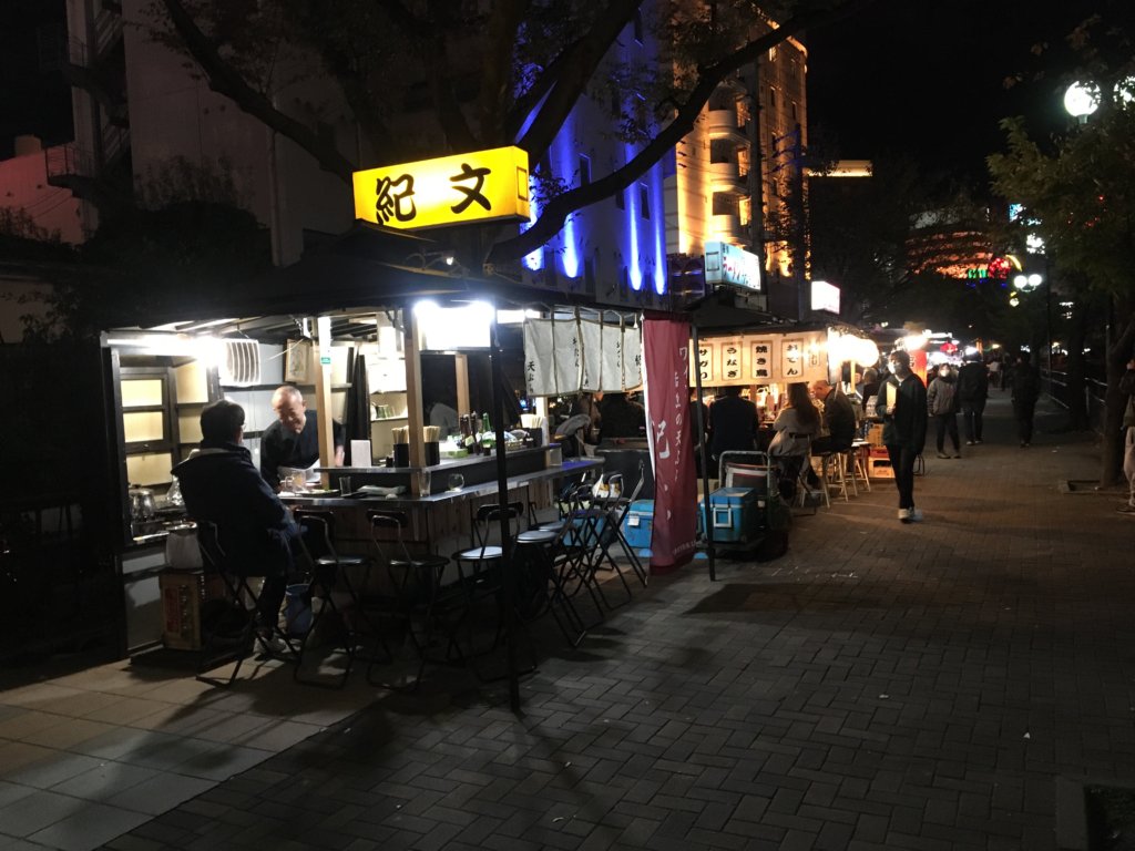 上の写真は中洲の屋台。たくさんの屋台が軒を連ねています。